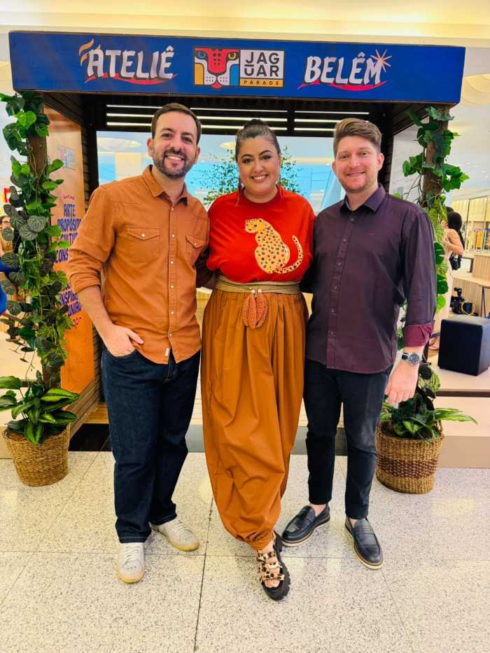 A embaixadora da Jaguar Parade, Dani Filgueiras, o assessor Jeferson Hoenisch e o colunista, durante o evento de lançamento da Jaguar Parade
